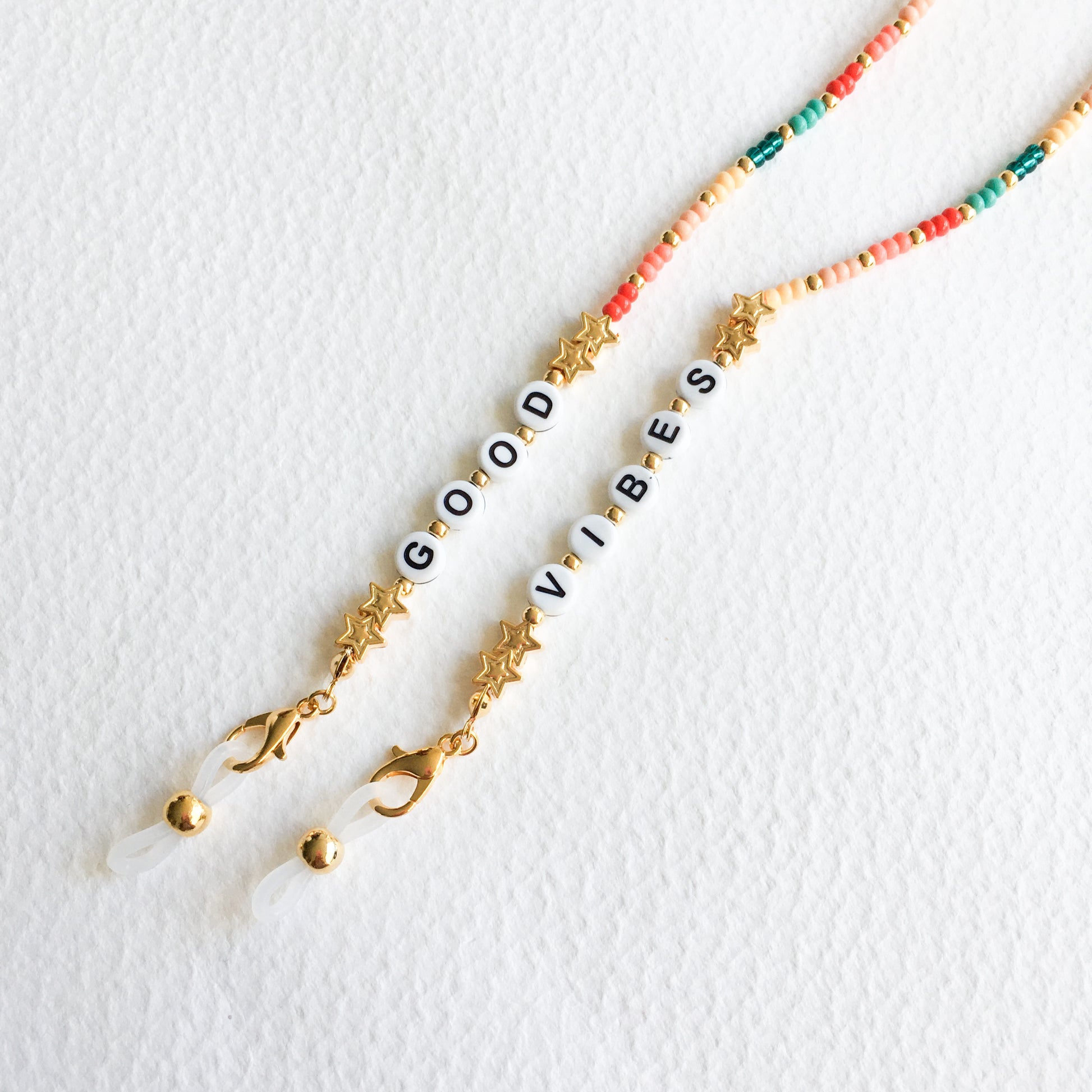Bring joy to your everyday style with the Good Vibes glasses holder. Bright colors and playful beads channel that carefree summer feeling perfect for beach days, weekend plans, or just adding a little happiness to your daily outfit.